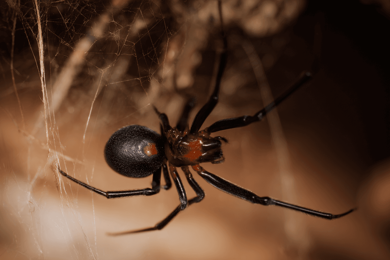 Black widows are the shiny black spiders with the red hourglass mark on the belly. They like quiet, tucked-away spots such as garages, sheds, woodpiles, and under patio furniture. You will often see messy, irregular webs near ground level rather than the classic “storybook” orb web.