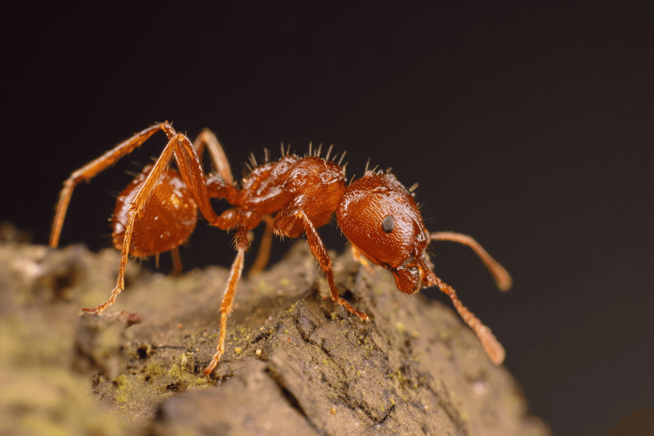 Fire ants build crumbly dirt mounds in lawns, near sidewalks, and around utility boxes. Disturb a mound and they respond fast, climbing onto shoes and ankles and delivering painful stings. Their bodies are usually reddish brown, and you may see multiple, irregular mounds in sunny areas.