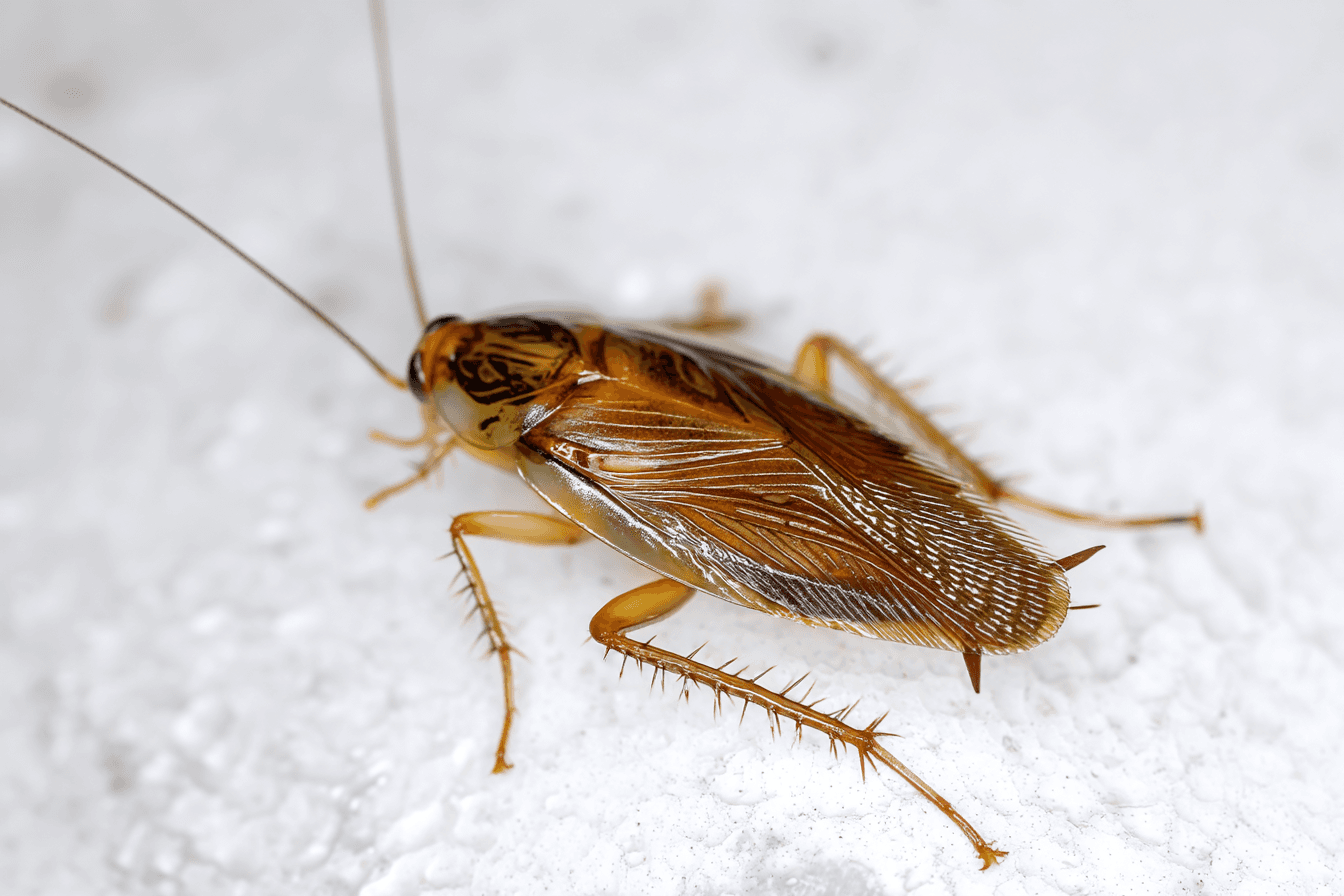 German cockroaches are small, light brown roaches with two dark stripes behind the head. They love warm, humid areas near food and water, such as kitchens, bathrooms, and laundry rooms. You may see them scatter when a light flips on or find droppings and egg cases in cabinet hinges and appliance gaps.