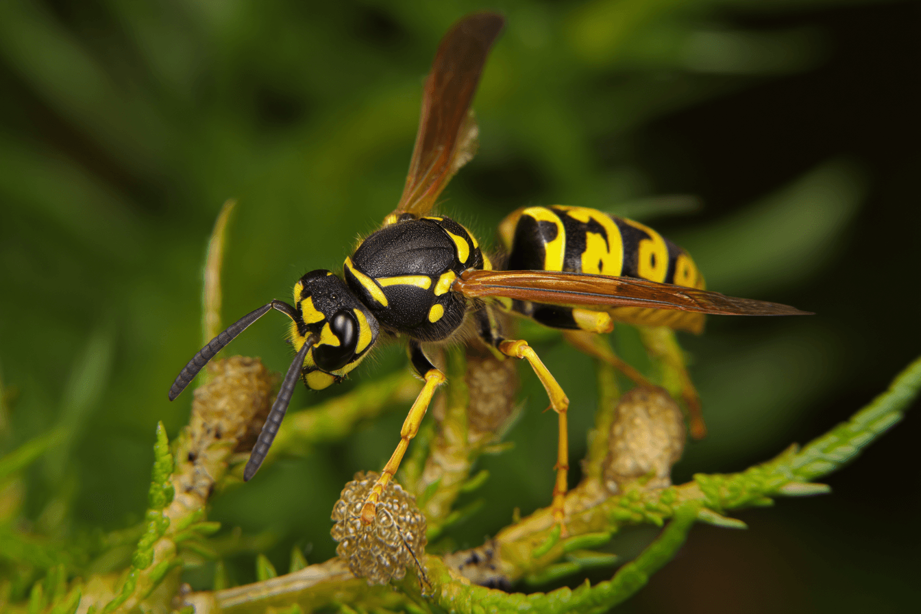 Yellowjackets are stocky, black-and-yellow wasps that nest in the ground, wall voids, and sometimes in attics. You may notice lots of activity around a single hole in the ground, or see them hovering near siding, deck steps, or landscape features.